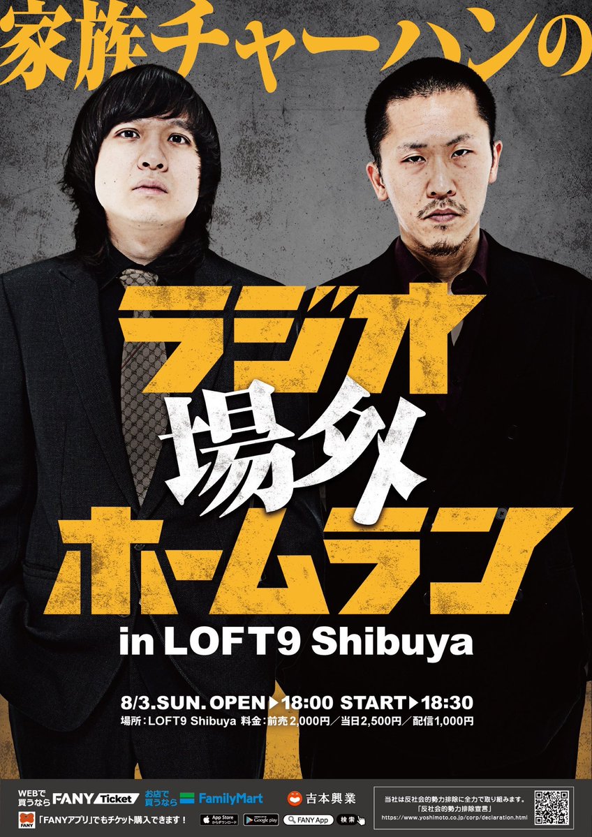 SCHEDULE 2025 08 03 Sunday 家族チャーハンのラジオ場外ホームラン OPEN 18:00 - START 18:30 Tweet 【出演】家族チャーハン(江頭、大石) TICKETチケットの購入はこちらから! 前売りSOUDOUT!当日券の販売はございません。 #家族チャーハン(江頭、大石) ※フラワースタンドの設置はできません。お花をお贈り頂く場合は卓上サイズのアレンジメントをご利用ください。 Share