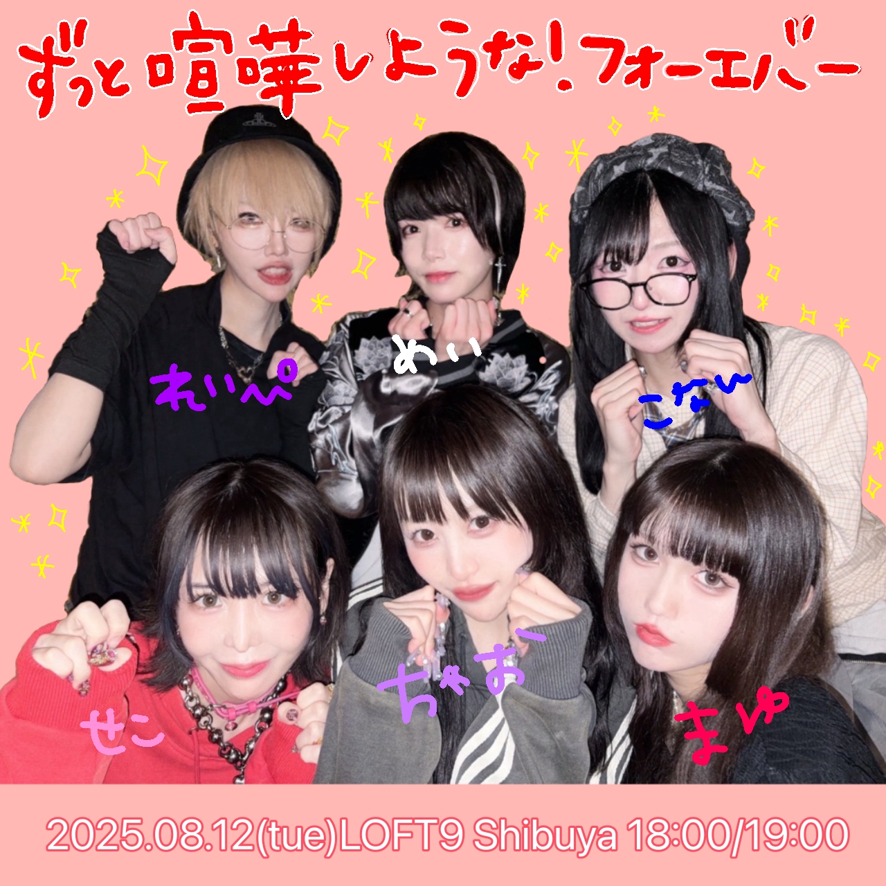 SCHEDULE 2025 08 12 Tuesday 『ずっと喧嘩しような!フォーエバー』 OPEN 18:00 - START 19:00 Tweet 【出演】 大森靖子 荼緒あいみ 千椿真夢 夜椿娘男 白椿明溟 世椿玲灯 TICKET[会場チケット] 前売券 ¥3,000(要1Drinkオーダー) 当日券¥4,000あり! ※フラワースタンドの設置はできません。お花をお贈り頂く場合は卓上サイズのアレンジメントをご利用ください。 Share