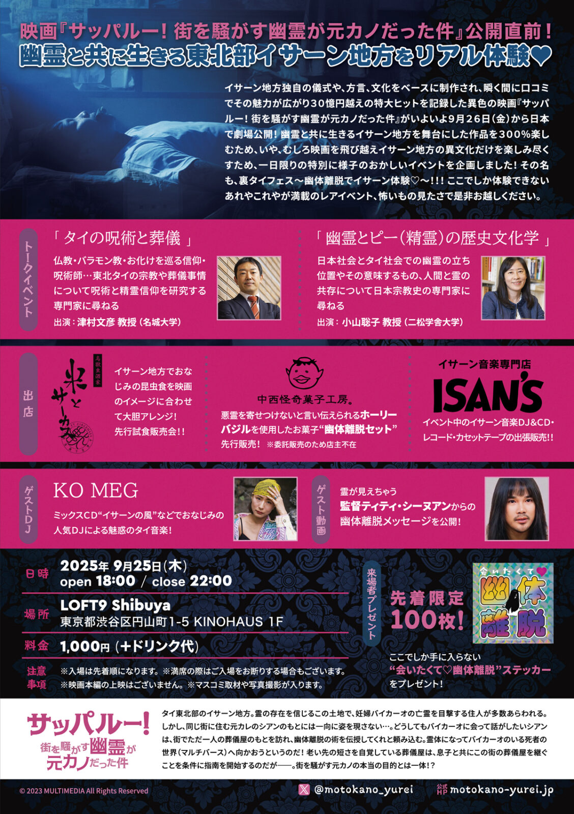 なんと公開直前の9月25日(木)に、映画が生まれた地・タイ東北部のイサーン地方を体験できる特殊イベントを開催決定。幽霊と共に生きるイサーン地方を舞台にした本作を300%楽しむため、いや、むしろ映画を飛び越え純粋にイサーン地方の異文化だけを 楽しみ尽くすため、一日限りの特別に様子のおかしいイベントが爆誕っ!!