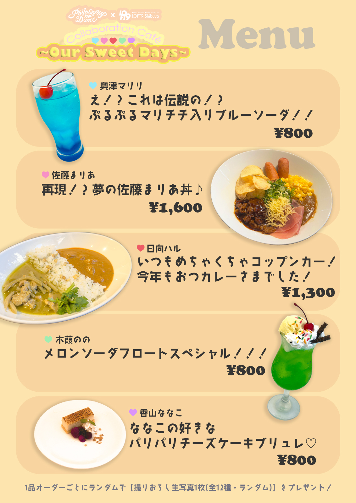 ※1品オーダーごとにランダムで【撮りおろし生写真1枚(全12種・ランダム)】をプレゼント!