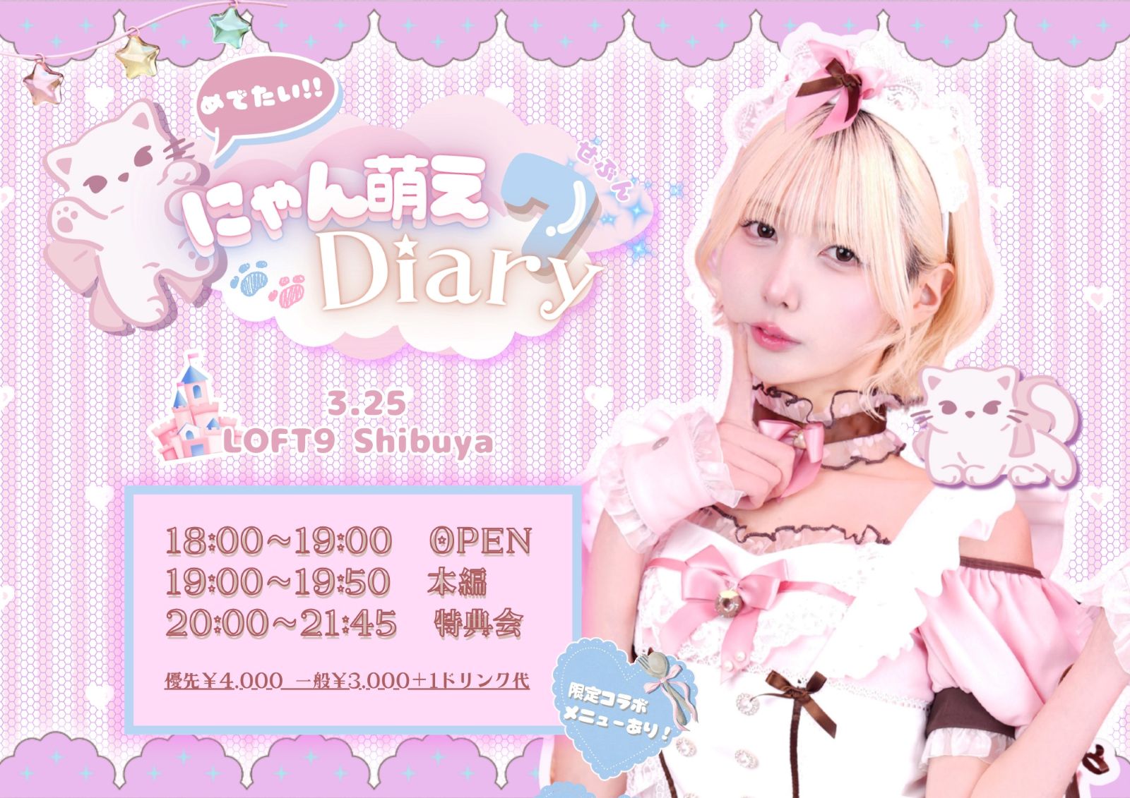 SCHEDULE 2026 03 25 Wednesday めでたい!にゃん萌え7Diary OPEN 18:00 - START 19:00 Tweet 【出演】ねこぜ TICKETチケットの詳細はこちらから #ねこぜ ※フラワースタンドの設置はできません。お花をお贈り頂く場合は卓上サイズのアレンジメントをご利用ください。 Share
