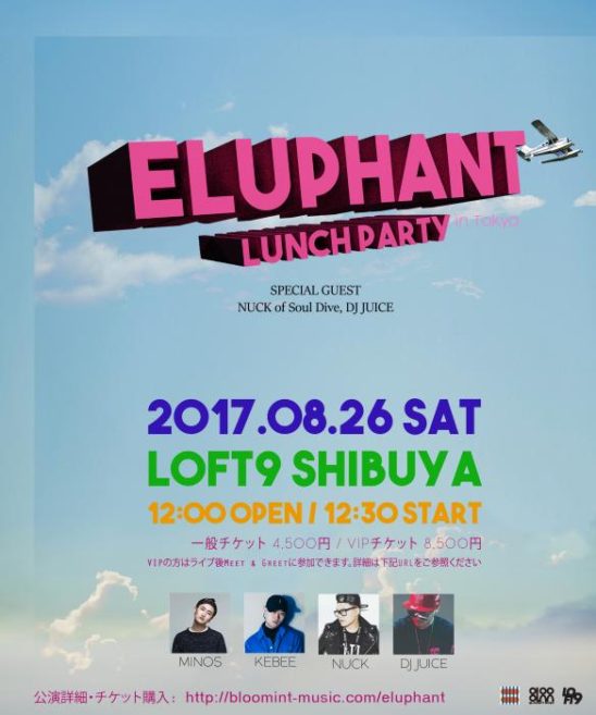 そんなEluphantが、本人たちたっての希望により、東京でランチパーティーを開催することになりました! スペシャルゲストにSoul Dive(ソウルダイブ)のリーダーであるNuck(ノック)を迎え、彼らのバックDJとしては絶対に欠かせないDJ Juice(DJジュース)も合わせて「日本のファンの皆さんと一緒にランチを楽しもう!」というコンセプトで開催します。
