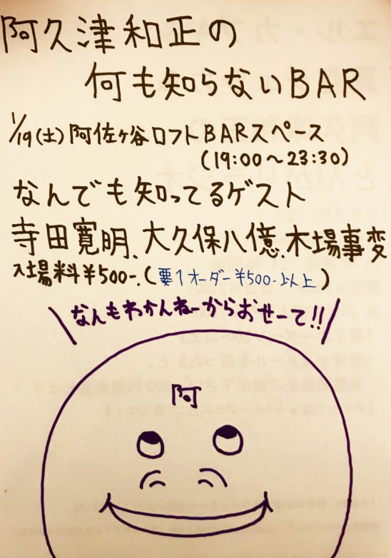 SCHEDULE 2019 01 19 Saturday 阿久津和正の何も知らないBAR ※BAR ホールでの開催です Tweet 【何も知らない人】 阿久津和正 【教えてくれる人】 寺田寛明 大久保八億 木場事変 本当になんも知らない阿久津さんが お客様から知らない事を教えてもらうBARイベントです! TICKETOPEN 19:00 / CLOSE 23:00頃 入場¥500(別途1オーダー¥500以上) Share