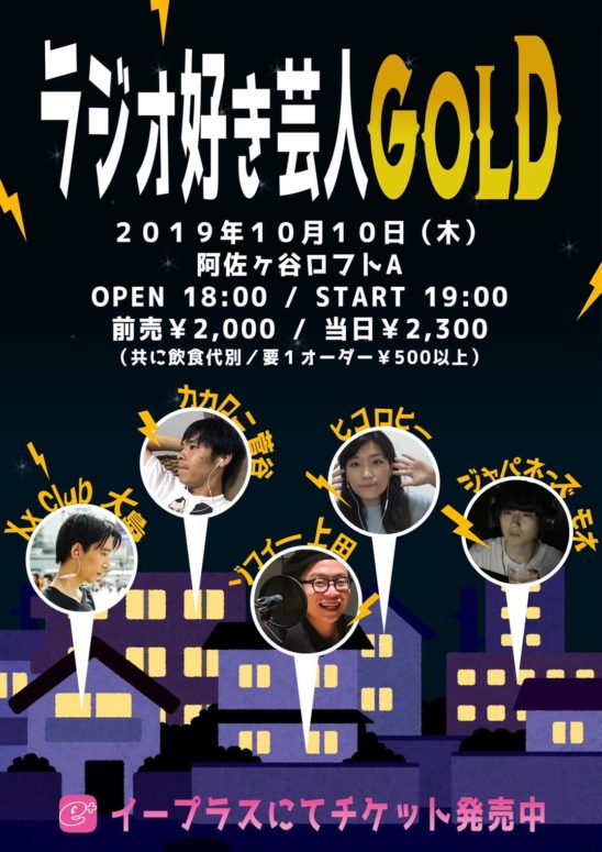 「ラジオ大好きだけど、まだラジオ番組を持てていない芸人達」によるオールナイト・ラジオトークライブが、好評につき『GOLD』になって登場!
