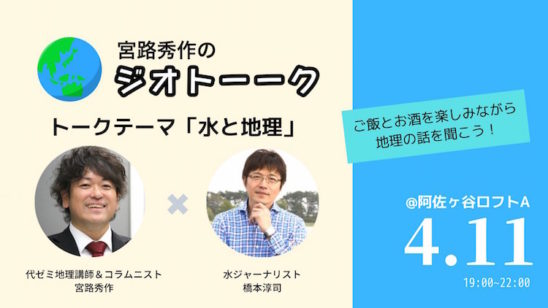 第1回目はゲストに「水ジャーナリスト」の橋本淳司さんをお迎えします。今年はいよいよ東京オリンピックの年。水泳会場の水は大丈夫なのか? そもそも東京の水は? 日本の水は? 世界の水は? など、「水」をテーマにジオトークを繰り広げます。