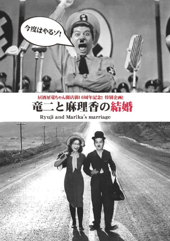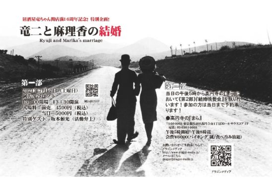 SCHEDULE 2021 07 17 Saturday DAY EVENT 居酒屋竜ちゃん開店16周年記念!特別企画 竜二と麻理香の結婚 OPEN 13:00 - START 13:30 Tweet 【出演】竜二、麻理香 【特別ゲスト】坂本頼光(活弁士) TICKET前売¥4,500 / 当日¥5,000(飲食代別) 昨年開催予定でした竜二と麻理香の結婚のローソンチケットをお持ちの方はご入場いただけます。 ※ご入場順はローソンチケット→Peatixの順となります。 前売チケット購入はこちら↓ Share
