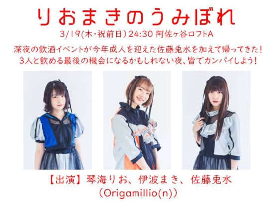 Origamillio(n)ラストライブ前に深夜の飲酒イベントが前回よりパワーアップして帰ってきた!今年成人を迎えた佐藤兎水を迎えて「りおまきのうみぼれ」を開催します!しかもかつて「レッツ呑む呑む」が行われたアイドルと酒の聖地・阿佐ヶ谷へ。3人と飲める最後の機会になるかもしれない夜、ぜひカンパイしに来てください!3人のスペシャルドリンク&おつまみもあります!