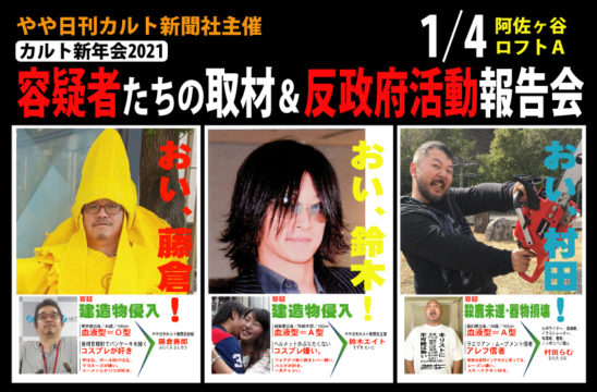 そんな被告人、容疑者、元容疑者たちが、2020年の自らの取材活動と反政府活動を報告し、2021年の政府転覆を誓う。現在制作中「全国会議員カルト紳士録」の内容も初公開!