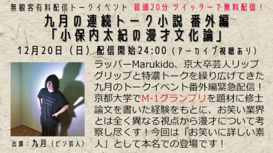 72時間ぶっ続けの軟禁コントライブ、ハフポストなどニュースサイトでの社会評論・文学評論、討論イベント司会、メディアでの性癖大暴露と、わけのわからない活動で注目の京大卒ピン芸人・九月のトークイベント、完全番外編!
