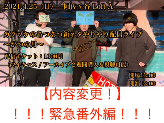 「ガクヅケのあつあつ新ネタやりやり配信ライブ緊急番外編〜あつやりふるの月ふりふりふり返りまくり+長尺じゃくじゃく新ネタ1本披露披露完全無観客ライブ〜」