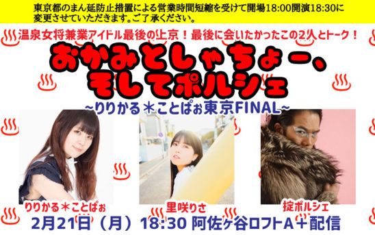 3月13日に活動終了することを発表した滋賀のアイドル兼宝船温泉の若女将・りりかる*ことぱぉさん。最後の上京タイミングでトークイベント決定! 最後に共演するのは会いたかったこの2人。まずは物販テーマや幻となった宝船アイドルフェスについてのトークイベントで何度も語り合った里咲りささん、そしてことぱぉさんが「最後に会いたい!」と指名した掟ポルシェさんをゲストに、ファイナルだから&この2人相手だから話せるアイドル業界のあれこれを始め、女将のおもてなしトークを堪能あれ!