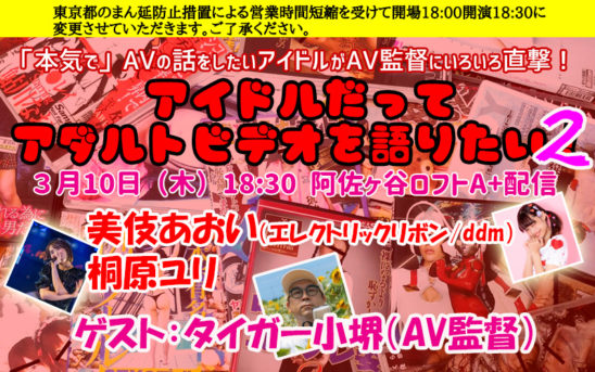 以前配信のみでお送りして好評だったガチでAV好きなアイドル2人が語り合うトーク、ついに有観客+配信で開催です! 前回から引き続きNTR&黒ギャル大好きな美伎あおいさんと義父と悪徳整体師ならまかせろな桐原ユリさんをメインに、今回はゲストに数々の人気単体女優を撮りまくってきたタイガー小堺監督を招き、こういう機会だからAV業界のあれこれを聞きまくり! アイドルとこんなキワキワな話を聞く機会は二度とないはず。自分の性癖をさらけ出す覚悟でお越しください!