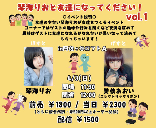 友達が少ない琴海りおが友達をつくるべく、コーナーごとにゲストを掘り下げて仲良くなろう!というイベントです。 最後はゲストに友達になれるかなれないか思い切って決めてもらっちゃいます!