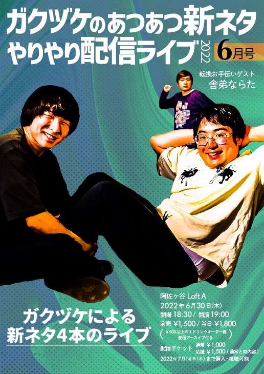 ガクヅケがこしらえたあつあつの新ネタ数本を皆様にお届け!来場者の方は配信アーカイブも無料で見れますので、帰宅してからも2度楽しめます!もしかしたら来場者のみ見れるネタもあるかも!?