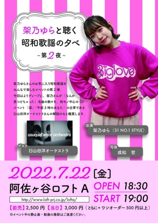 昨年6月、おかげさまで好評のうちに終えることのできた架乃ゆらさんのお気に入り昭和歌謡をみんなで楽しむイベントの第2弾!