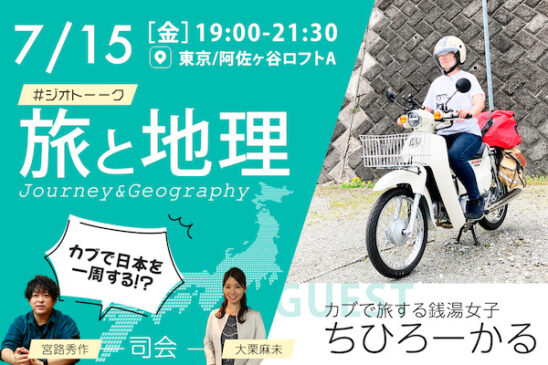 みやじまん祭、今回は「カブで日本を一周する銭湯女子」ことちひろーかるさんをゲストにお招きして、旅と地理について語り合います。