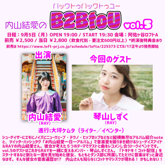 シューゲイザーにエモにノイズにニューウェーブ・テクノ・ヒップホップなどなど縦横無尽なアルバム紹介noteと、ツイッターハッシュタグ「#内山結愛一日一アルバム」で音楽愛を振りまき続けるシューゲイズアイドルRAYの内山結愛さん。彼女が考えた5つのテーマでゲストと曲をレコメンし合うトークイベントです。vol.5のゲストはこれからRAYを一緒に支えるメンバー・琴山しずくさん。「ドキドキ!コット配信」をスタートするなど新たな一面を見せ始めた彼女、もともとダンス部に所属してただけに音楽はずっと身近なはず。そんな彼女の音楽遍歴は!? 内山さんも知らないコットヤマシズクが現れる! かもしれない!