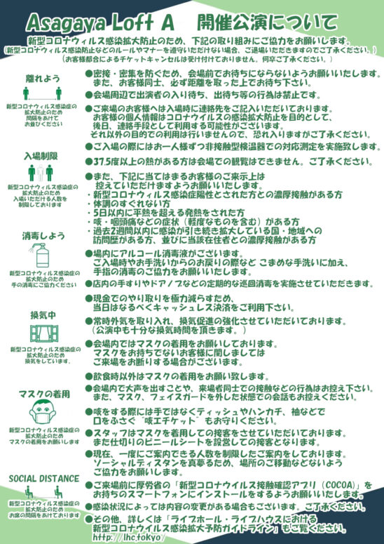 ※その他、詳しくは「ライブホール・ライブハウスにおける新型コロナウイルス感染拡大予防ガイドライン」もご覧ください。