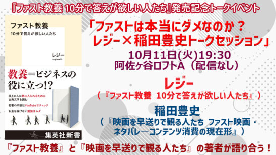 刊行を記念して『映画を早送りで観る人たちファスト映画・ネタバレ――コンテンツ消費の現在形』(光文社新書)がヒット中の稲田豊史さんをお招きしてトークセッションを開催。