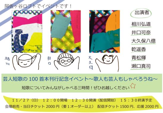 短歌のことをめいっぱい話す3時間、芸人、歌人、作家、などなど、名乗り方はそれぞれですが、短歌をやっている人間として対等に楽しくしっかり話ができたらいいと思います。