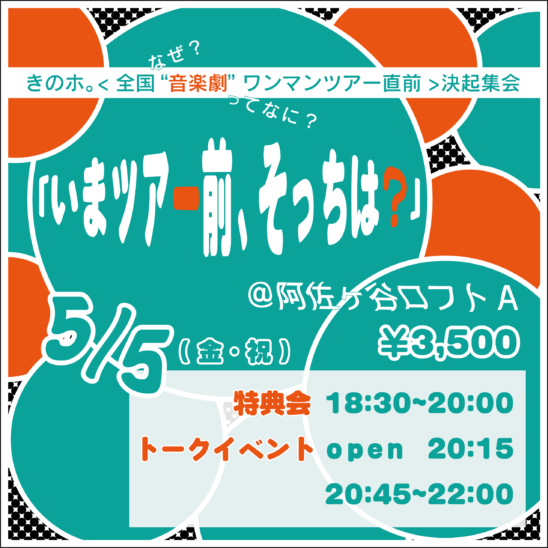 SCHEDULE 2023 05 05 Friday きのホ。<全国"音楽劇"ツアー直前>決起集会 【いまツアー前、そっちは?】 Tweet 【出演】 きのホ。 ツアー直前のきのホ。トークイベント!! TICKET特典会 18:00~19:30 / open19:45 start20:15 【会場観覧】前売 ¥3,500 / 当日 ¥4,000 (ともに飲食代別・要500円以上オーダー必須) 【配信】FC限定で後日販売予定!! チケット詳細はきのホ。HPにて!! ※FC先行→一般 Share