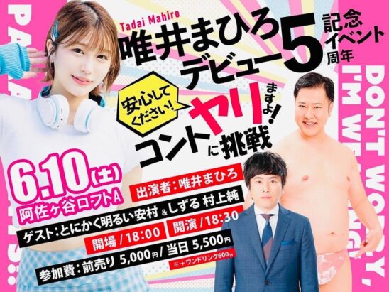 SCHEDULE 2023 06 10 Saturday 唯井まひろデビュー5周年記念イベント ー安心してください!ヤリますよ!コントに挑戦ー OPEN 18:00 - START 18:30 Tweet 出演者:唯井まひろ ゲスト:とにかく明るい安村、しずる 村上純 TICKETLivepocket前売 ¥5,000 ※5/10(水)19:00より発売開始! 当日 ¥5,500 飲食代別・+1D以上 ※現金、クレジットカード、各交通系ICカード、PayPay等でお支払い可能です。 Share