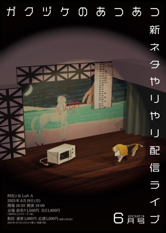 ガクヅケがこしらえたあつあつの新ネタ数本を皆様にお届け!来場者の方は配信アーカイブも無料で見れますので、帰宅してからも2度楽しめます!もしかしたら来場者のみ見れるネタもあるかも!?