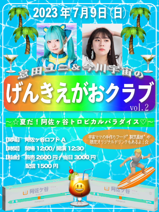げんきえがおクラブとは、怠田ユニと今川宇宙によるトーク+楽しいこと盛りだくさんの季節ごとイベント。お仕事帰りに、またおやすみの日に、またまた配信でげんきえがおになっちゃおう。