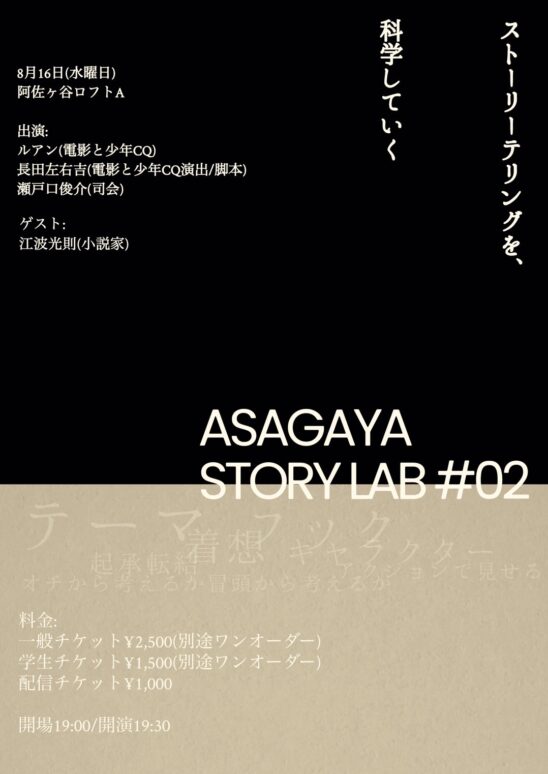 電影と少年CQのルアン、その演出/脚本をやっている長田左右吉、司会者の瀬戸口俊介が様々なストーリーテリングを生業にしている方をゲストにお呼びしてストーリーを学び、ルアンが物語を完成させる企画第二段!