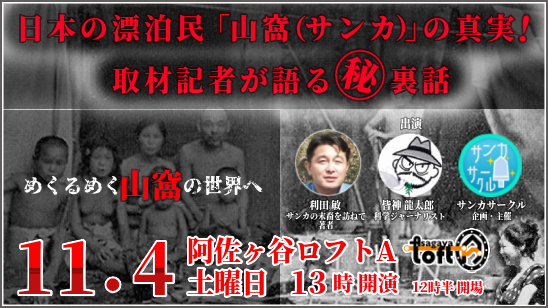 最後のサンカや、サンカの末裔を執念で突きとめて取材をされた貴重な体験について、実際に取材に当たられた記者や関係者をお招きし、たっぷりとお話していただきます。