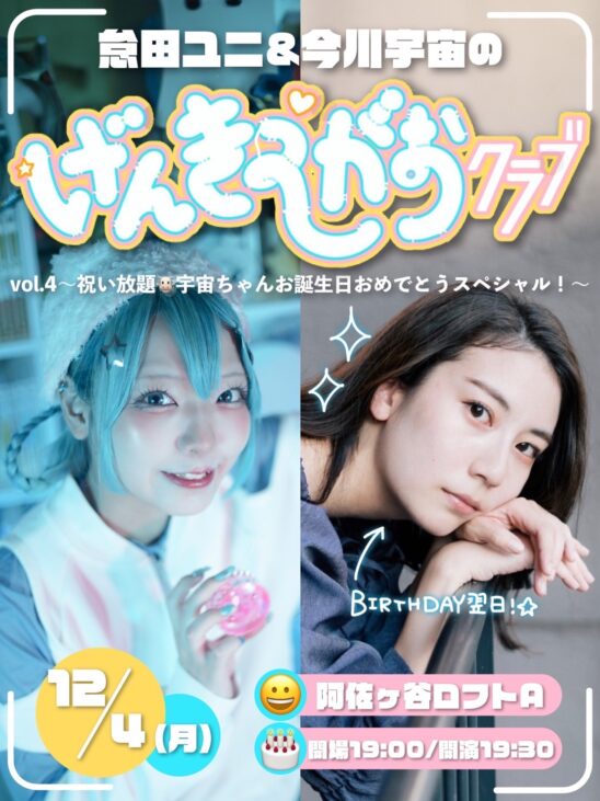 げんきえがおクラブとは、怠田ユニと今川宇宙によるトーク+楽しいこと盛りだくさんの季節ごとイベント。お仕事帰りに、またおやすみの日に、またまた配信でげんきえがおになっちゃおう。