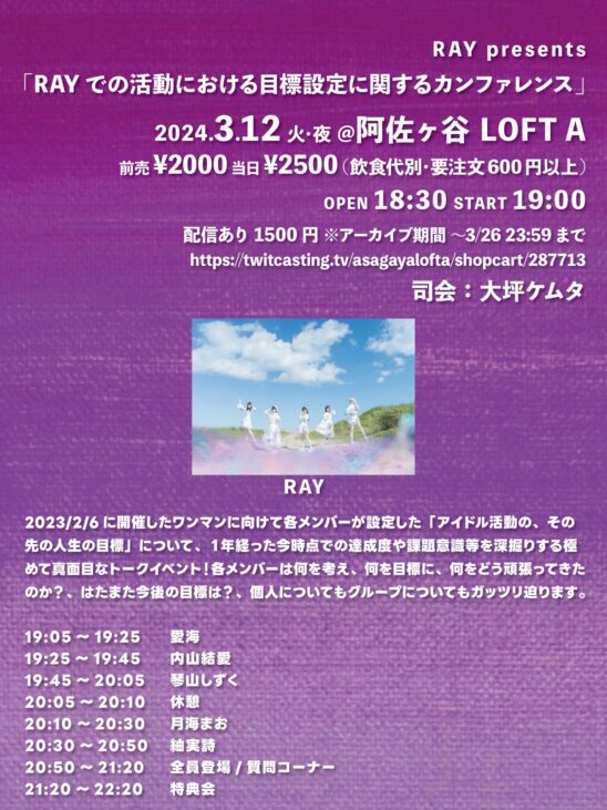 2023/2/6に開催したワンマンに向けて各メンバーが設定した「アイドル活動の、その先の人生の目標」について、1年経った今時点での達成度や課題意識等を深掘りする極めて真面目なトークイベント!各メンバーは何を考え、何を目標に、何をどう頑張ってきたのか?、はたまた今後の目標は?、個人についてもグループについてもガッツリ迫ります。