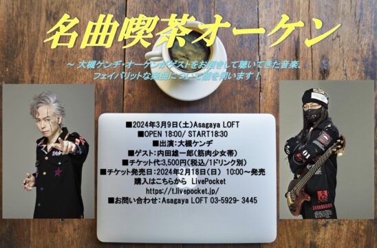 SCHEDULE 2024 03 09 Saturday 名曲喫茶オーケン 〜 大槻ケンヂ・オーケンがゲストをお招きして聴いてきた音楽、フェイバリットな楽曲について話を伺います! OPEN 18:00 - START 18:30 Tweet 【出演】大槻ケンヂ 【ゲスト】内田雄一郎(筋肉少女帯) TICKET会場前売券完売!! 当日券はございません。 ■チケット代:3,500円(税込/1ドリンク別) ■チケット発売日:2024年2月18日(日)10:00~発売 詳細はこちらから(LivePocket) Share