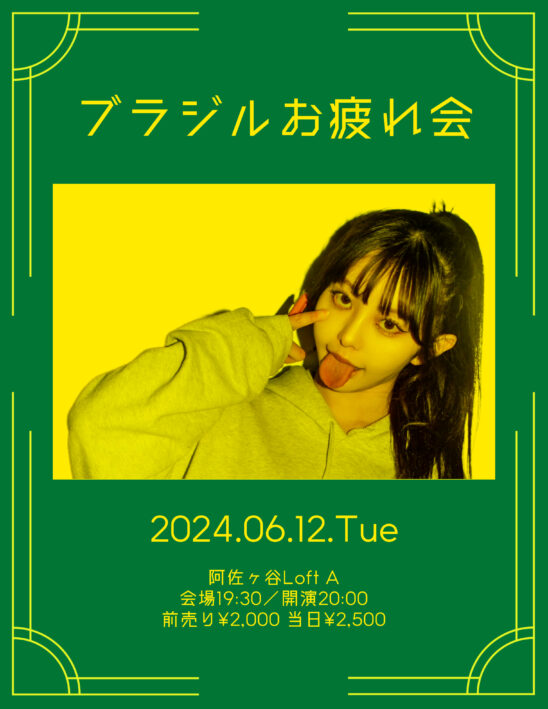 SCHEDULE 2024 06 12 Wednesday 【会場限定 / 配信なし】 『ブラジルお疲れ会』 Tweet 【出演】 ブラジル トークショー的な打ち上げ的なイベントです!遊びにきて! TICKETOPEN 19:30 / START 20:00 前売¥2,000(1order別途) / 当日券の販売はございません。 チケットは4/23(火)21:30~よりLivePocketにて発売! 購入はこちら!!→https://t.livepocket.jp/e/yvgl5 Share