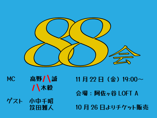 『88会』とは、過去に作品を共にした高野八誠 八木毅がMCとして、ゲストをお呼びしMCの2人が聞きたかった事、お客様が聞きたいと感じている事をゲストの皆様に聞きながら進行していくトークイベントです。