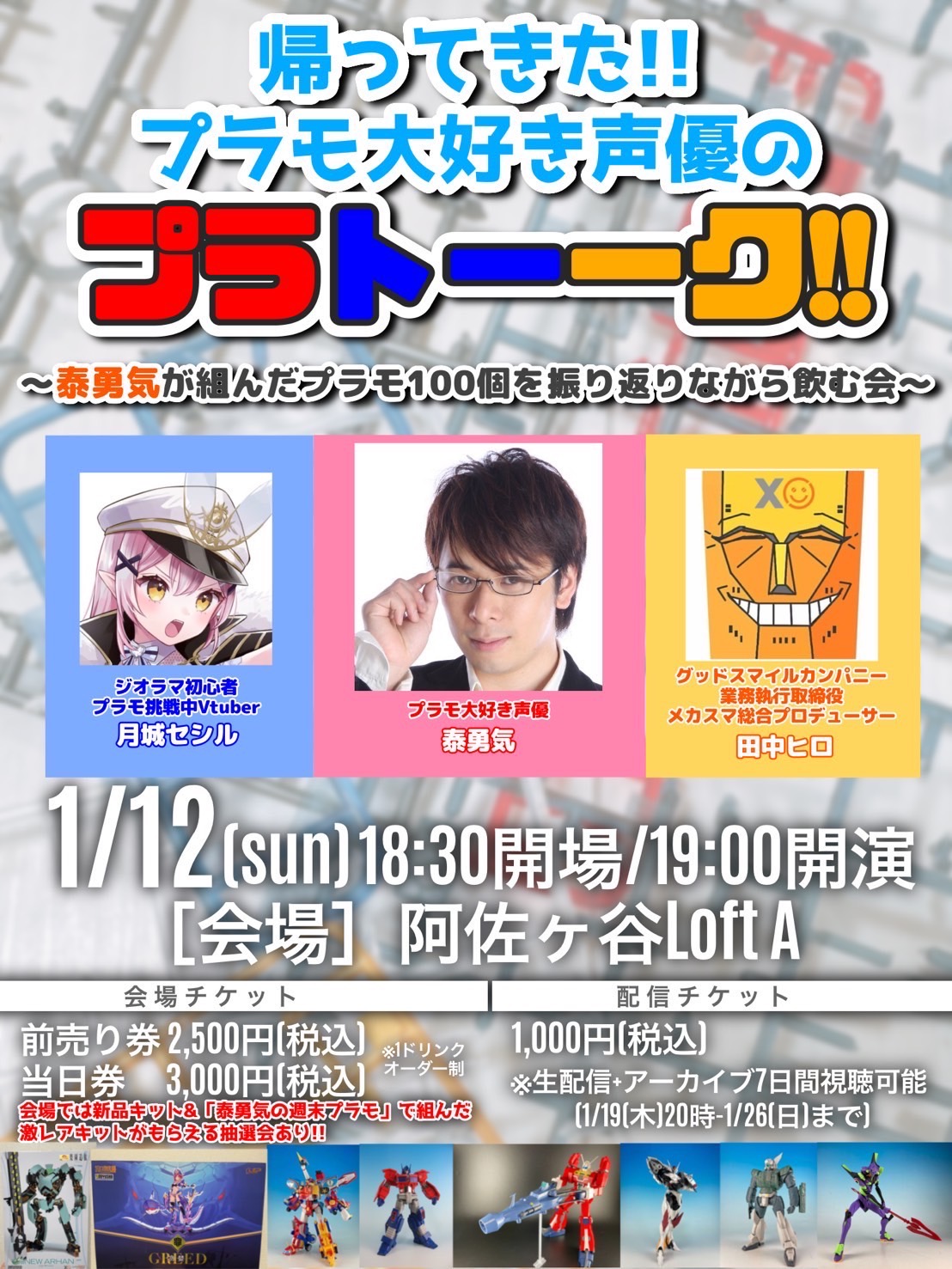 連載100回でご紹介してきた100個のプラモの画像を一緒に見つつ、ここ数年のプラキットの様子を出演者が語り合います。