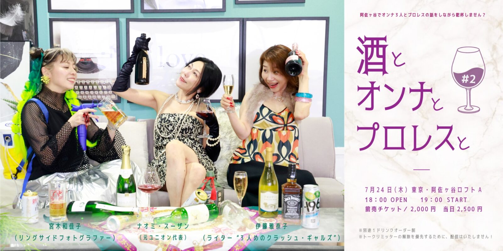 プロレスオンナ3人衆が今年2月に爆誕させた大宴会トークイベント「酒とオンナとプロレスと」が、バージョンアップして帰ってくる! 初回は、発売と同時に増席・完売というスーパーミラクルが発生して、「行きたかったのに」と落胆したファンがいた。そ・こ・で……。今回は、キャパを拡大。しかし、カネより質を重んじて、採算度外視の「配信なし」、録音、録画、トーク内容のポストはNGを貫徹します。宮木はリングサイドの女流フォトグラファーの先駆けで、現在はプロレスリング・ノア公式FCのプロデューサー兼公式カメラマン。いまも写真集出版やグッズ制作、個展開催ほか業界発展に尽力する。ナオミはDDT創世期のヴェールに包まれたマネージャーで、2015年までユニオンプロレスの代表。「藤木蜜」名義で女優活動も続ける。伊藤は「週刊ファイト」「週刊ゴング」ほか専門誌の元女子プロレス記者で、柳澤健=著の「1985年のクラッシュ・ギャルズ」(文藝春秋、光文社)に“3人目のクラッシュ”として登場する。そんな3人がプロレスを酒の肴にして、筋書きなし、台本なし、脱線ありのトークを展開するオトナの悪ふざけ。さぁ、KP(乾杯)タイムの再宴です。