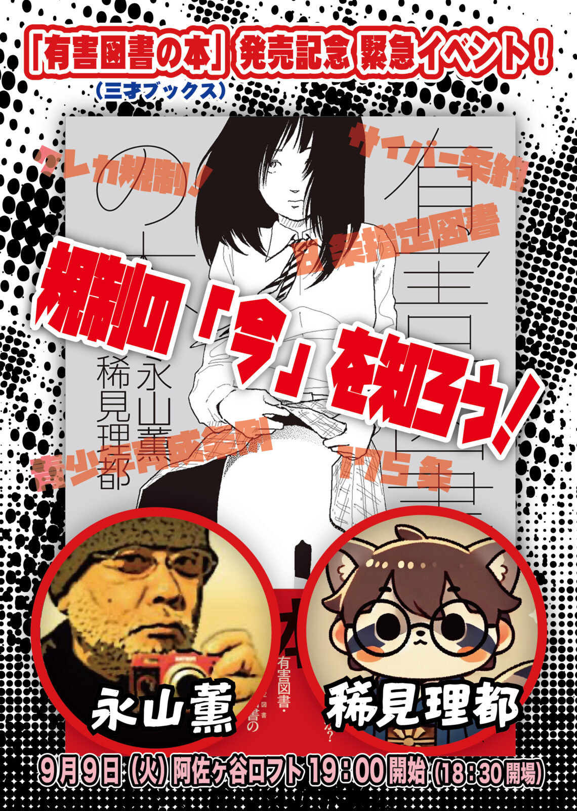 長年、全国の有害図書問題について調査し、その必要性や運用のあり方などに疑問を呈してきた専門家、永山薫と稀見理都の新刊「有害図書の本」(三才ブックス)の発売を記念し、規制に関わってこられた関係者を招き、緊急イベントを開催。