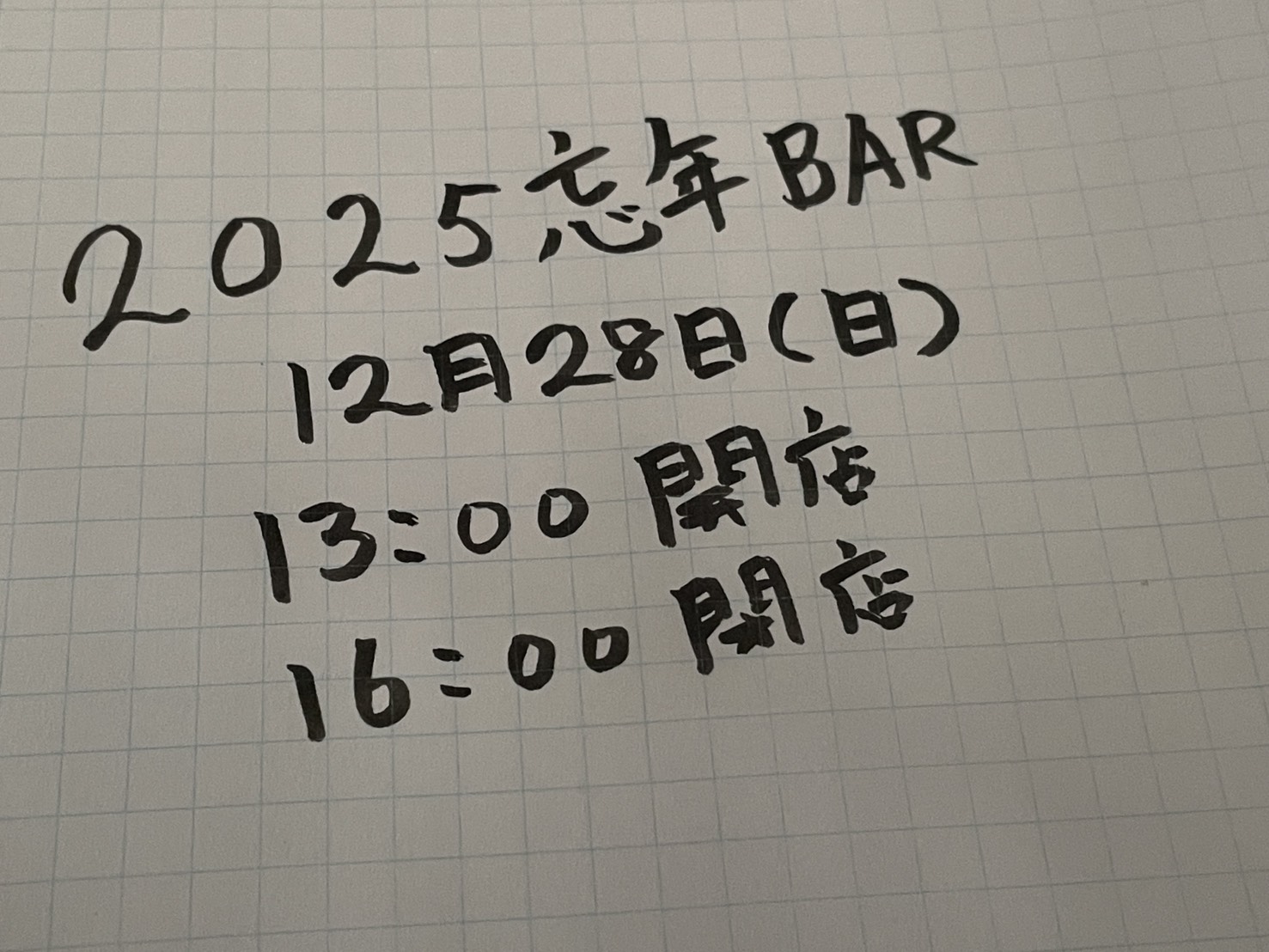 SCHEDULE 2025 12 28 Sunday BAR 2025忘年BAR START 13:00 / CLOSE 16:00 Tweet 【マスター】 瀬戸口俊介(@setonomegane) 忘れてよいこと 忘れちゃダメなこと。 それは人それぞれだけど とりあえず忘年BARに 集いましょう。 2025年おしまい!! TICKET【チャージ】 ¥700(+¥500以上1DRINKオーダー) Share