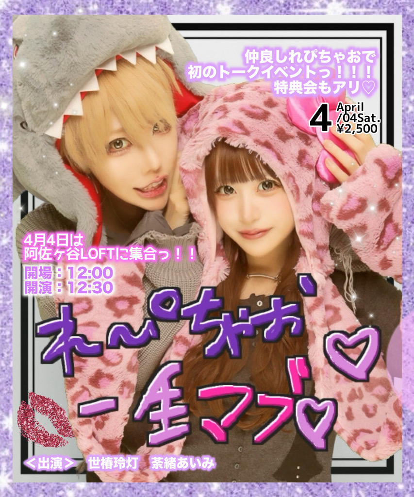 SCHEDULE 2026 04 04 Saturday DAY EVENT 配信なし れぴちゃお一生マブ♡ OPEN 12:00 - START 12:30 Tweet 【出演】 世椿玲灯 荼緒あいみ TICKET【会場チケット】チケットは3/22(日)18:00~発売開始!! 前売 ¥2,500 ※飲食代別・要500円以上1DRINKオーダー必須 購入はこちら→https://livepocket.jp/e/w38ta Share