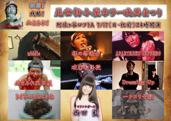死に損ないの血まみれホラー映画監督田代尚也が選ぶ至極の残酷ホラー映画まつり!若手を中心にインディペンデントで作られたホラー映画を集めて上映する、真夏の衝撃オールナイトイベント。スペシャルゲストアシスタント(マドンナガール)を美少女アイドルライターの西田藍が務める!刃物が飛ぶ!血が飛ぶ!!生首が飛ぶ!!!たーまーやー!!!!納涼ホラー映画まつり!!一晩のおまつり限定の見世物小屋だよ!よってらっしゃい!みてらっしゃい!朝まで生きている保証 はないよ !!!・・・・・・ごめん、ちょっと煽りすぎた。危険な目には合わせないし、女性独りでも大丈夫だから気軽に遊びに来てね。全部面白くて楽しいよ!