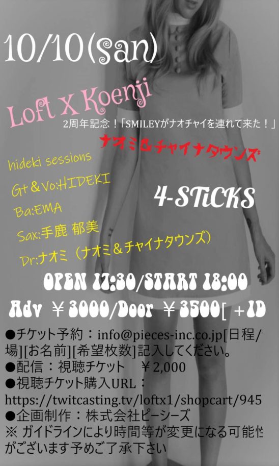 【出演】ナオミ&チャイナタウンズ/4-STiCKS/ hideki sessions[Gt&Vo:HIDEKI/Ba:EMA/ Sax:手鹿 郁美/Dr:ナオミ(ナオミ&チャイナタウンズ)]