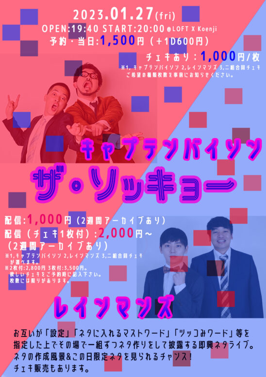 お互いが決めたテーマに従ってネタを作り、披露まで行っていただきます。ここでしか見られないネタもあるかもしれないのでこの機会にぜひお越しください。