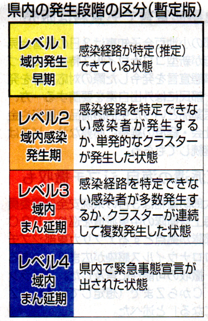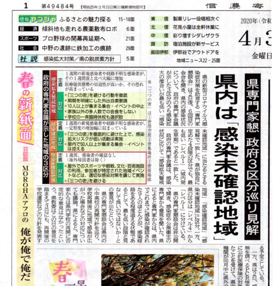 ただし、お店の営業は通常通り続けます。営業を続ける裏付けは下記の記事によります。政府の専門家会議が示した地域の3区分の内、長野県は「感染未確認地域」との見解が出たからです。また県内の発生段階の4区分の内「レベル1」としている事です。つまり「感染経路が特定(推定)できている状態」でありクラスターが発生していないからです。首長の多くが「ライブハウスに行くのを自粛して!」と声高におっしゃっているのにライブハウスや出演者に対して何の救済策を示していない現状です。「営業妨害じゃないか!」と叫びたいのを我慢しています。従って長野県が「感染拡大警戒地域」になった場合もしくは「レベル3」になった場合は営業を中止致します。
