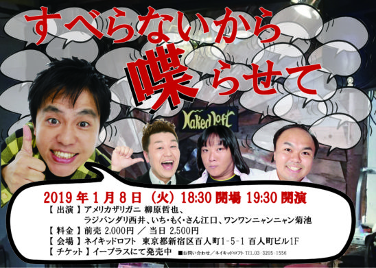 SCHEDULE 2019 01 08 Tuesday 「すべらないから喋らせて」 OPEN 18:30 - START 19:30 Tweet 【出演】アメリカザリガニ柳原、ラジバンダリ西井、ワンワンニャンニャン菊池 、いち・もく・さん江口 アメリカザリガニ柳原の企画ライブ。 なるべくすべらないように時間いっぱい小噺をするトークライブです。 TICKET前売¥2000 / 当日¥2500 ※要1オーダー(¥500以上) ※前売券はe+にて12月1日(土)12:00より発売開始 ! Share