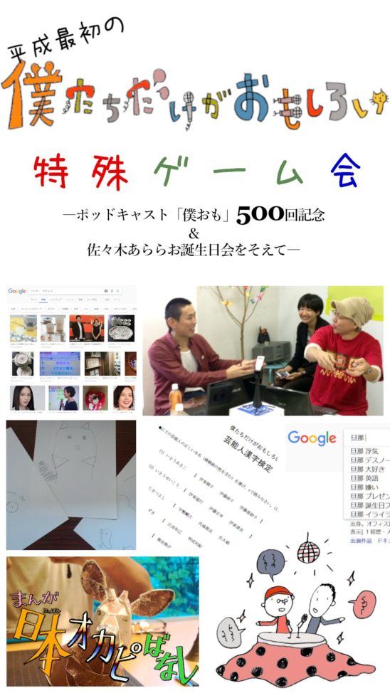 2006年12月、誰からも望まれないまま誕生したポッドキャスト番組「僕たちだけがおもしろい」が、今年2月になんと通算500回目の配信を迎えます。というわけで、パーソナリティの猫歌人・仁尾智とエロ歌人・佐々木あららのコンビが番組内でこれまでに遊んできた奇妙なオリジナルゲームの数々を、みんなでライブで遊んでもらおうぜ!というイベントを開催します。「ズコット」「ナカサラ」「ぎりぎりベッキー」「ぐぐるさま」「あれもこれもヒロシ」……タイトルだけではなんのことだかさっぱりわからない奇ゲー・怪ゲーを、みんなでやって盛り上がりませんか。同時開催で、2/17に誕生日を迎える佐々木あららのお誕生日会もやっちゃいます! 平成最初で最後の僕おもゲーム祭り、リスナーのみなさまもそうでないみなさまも、ぜひご参加ください!