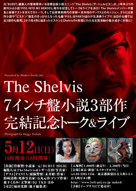 元『BURST』編集人の曽根賢率いる自費出版小説ユニット「The Shelvis(ザ・シェルビス)」が、2年半ぶりの新刊3rd小説『PISS INTO MY HEROES』発刊を記念してトーク&ライブを決行! The Shelvisメンバーや盟友と豪華ゲストを交えてのトーク、そして白夜書房時代の恩師=末井昭のサックスとのセッション、さらには新作小説や“ピスケン”誕生のきっかけとなった名曲『PISS』をPANTA自らが生演奏ライブ!!! 当日の会場では全3部作も販売、2015年4月に始まったピスケンとShelvisの4年間にわたる文芸活動の集大成がこの夜に!