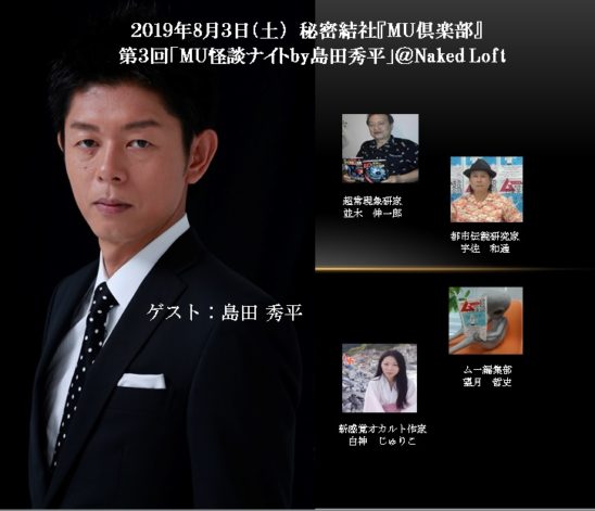 熱烈なMU倶楽部ファンの期待にお答えし、第3回目は、なんと“怪談の貴公子”島田秀平氏をゲストのお迎えし、他では聞けないゲキヤバ怪談を特別に語っていただく!手相占いや都市伝説で知られる島田氏は、2012年に「稲川淳二の怪談グランプリ」で優勝するなど、芸能界屈指の怪談テラーでもある。