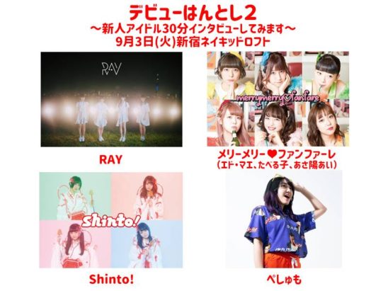 デビューからわずか一年たらず、しかしライブで魅力的なパフォーマンスを見せているグループを集めたトークイベント、第2弾開催! ステージの良さは知ってるけども、あらためてメンバーのキャラを掘り下げれば一層好きになること間違いなし。今回登場するのは令和初日にデビューしたグループもソロも個性ありなRAY、エネルギッシュなアイドルファンクで骨の髄から踊らせるメリーメリーファンファーレ、一周年ワンマンも目前なジャパニーズでキュートな4人組Shinto!、そして不安定なボーカルが癖になる阿佐ヶ谷ロフトAのバイト&アイドル・ぺしゅも!今回もフレッシュかつ個性満点なメンバーでお届けします!