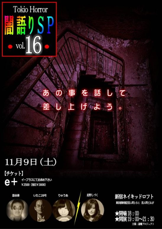 SCHEDULE 2019 11 09 Saturday TOKYO闇語りSP 16 OPEN 18:00 - START 19:00 Tweet 【出演】雲谷斎、いたこ28号、りゅうあ 【ゲスト】星野しづく 2012年からはじめて、今回で16回目。 雲谷斎、いたこ28号、りゅうあのレギュラー陣に、毎回怪談で活躍されていらっしゃる方をお呼びして、繰り広げる怪談イベントです。 今回は、女流怪談師で確たる地位を確立されています星野しづく。 ぜひお楽しみに❗ TICKET前売¥2500 / 当日¥3000 (共に飲食別) 前売はe+にて9/29(日)12:00より発売! Thank You SoldOut!!※当日券の販売はございません。 Share